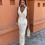 A fitted sleeveless dress with wide straps and a V-neck that accentuates the chest. The woven design offers a refined and original texture. The long, fitted silhouette gently follows the body's shapes, creating a bold yet elegant look.