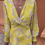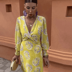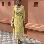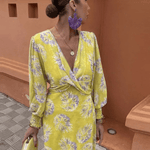 The floral pattern against a yellow background brightens the silhouette, while the deep cut and gently emphasized waist highlight the curves naturally.