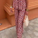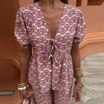 • Features: V-neck, short puff sleeves, two-piece set with geometric pattern