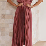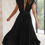 Timeless Elegance – The V-neckline and flowing pleats create a classic, stylish look.