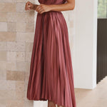 The Alexis dress offers a timeless, elegant look. With a draped V-neckline, a high waist, and a flowing skirt with umbrella pleats, it creates a beautiful, harmonious silhouette. Perfect for women who appreciate subtle elegance and comfort. Whether for a wedding, a relaxed evening, or a modern, casual look – the Maria dress is versatile for many occasions.