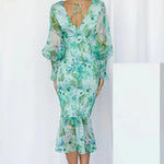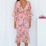 Our Miley dress offers the perfect combination of elegance and comfort, making it an essential piece for your spring and summer wardrobe. This midi dress for women features a charming floral print, long puff sleeves, and a flattering V-neckline. The fitted top seamlessly transitions into the lower part, ensuring a comfortable and flattering fit.