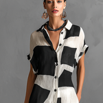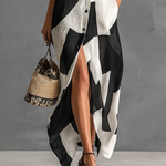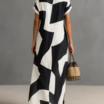This maxi shirt dress in chiffon features an irregular geometric print that adds a modern and artistic touch. The turn-down collar and the single button-down design add a classic flair, while the lightweight fabric keeps you cool and comfortable.