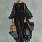 A lightweight chiffon maxi dress with a relaxed fit, elegant long sleeves, and a drawstring waist for adjustable style and comfort.