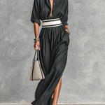 This elegant maxi dress is made from soft cupro imitation fabric, featuring a classic lapel collar and a single-breasted front closure. The long sleeves and defined waist create a flattering silhouette, perfect for sophisticated occasions.