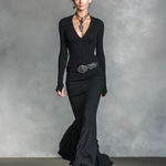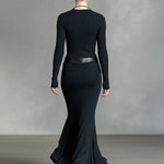 This elegant maxi dress features a flattering V-neckline and a slim-fit design, carefully crafted from soft knitted fabric. With long sleeves for a touch of warmth and elegance, this dress is perfect for any occasion. Please note that the belt is not included.
