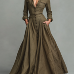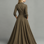 This vintage-inspired maxi dress is made from a soft blend of breathable cotton and linen, featuring a classic shirt design and a floor-length silhouette for an elegant and timeless look.