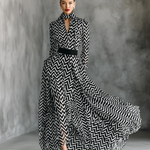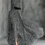 This fluid chiffon dress features a bold striped pattern with a cinched waist and tie neck detail. The soft fabric and wide skirt create an elegant movement.
