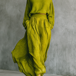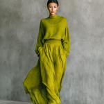 This green ensemble features a relaxed high-neck top and wide-leg trousers made from a soft cotton-linen blend. It offers effortless style with a fluid shape and natural texture.