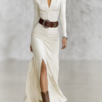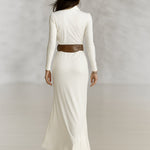 This elegant maxi dress features a classic notched collar and long sleeves, designed with a silhouette that cinches at the waist to enhance your figure. The flowing maxi length adds grace and sophistication, perfect for both formal and informal occasions. (Belt not included.)