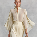 Two Piece Set High Neck Pleated Chiffon Shirt for Women with Bell Sleeves and Long Skirt with Slit