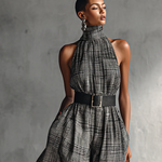 This elegant check maxi dress features a refined high neck and a sleeveless cut, offering a balance of structure and grace. The belted waist defines the figure, while the classic check pattern adds a touch of timeless charm.