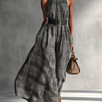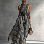 Women's Check Pattern Maxi Sleeveless Dress with High Neck