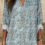 • Style: V-shaped neckline with rolled sleeves and textured floral details