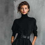 Two-Piece Women's Set: Black Long-Sleeve Top with High Neck and Straight Leg Trousers (including Belt)
