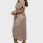 The pleated waist with the decorative tie is a true flattery and fits every body shape perfectly.