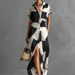 Women's Maxi Shirt Dress in Chiffon with Irregular Geometric Print and Turn-Down Collar