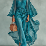 A lightweight chiffon maxi dress with a relaxed fit, elegant long sleeves, and a drawstring waist for adjustable style and comfort.