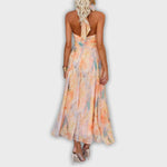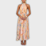 Are you looking for a dress that not only catches the eye but also perfectly showcases your feminine silhouette? Our Halter Neck Open Back Watercolor Print Maxi Dress is the answer to all your style wishes...