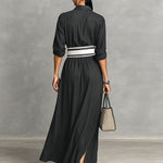 Maxi Long Dress in Cupro Imitation Fabric with Lapel for Women, Single-Breasted, Long Sleeves