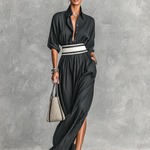 This elegant maxi dress is made from soft cupro imitation fabric, featuring a classic lapel collar and a single-breasted front closure. The long sleeves and defined waist create a flattering silhouette, perfect for sophisticated occasions.