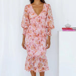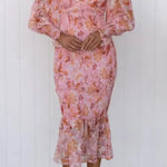Our Miley dress offers the perfect combination of elegance and comfort, making it an essential piece for your spring and summer wardrobe. This midi dress for women features a charming floral print, long puff sleeves, and a flattering V-neckline. The fitted top seamlessly transitions into the lower part, ensuring a comfortable and flattering fit.