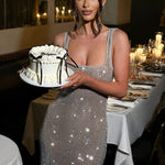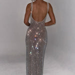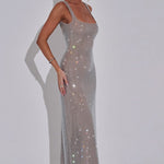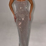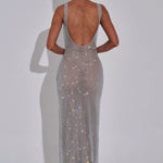 Be the star you are in the Petra dress, a shiny and sparkling maxi dress made of soft mesh with rhinestones all over. With a sexy and semi-transparent look, the dress features a square neckline and a low back.