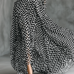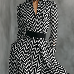 This fluid chiffon dress features a bold striped pattern with a cinched waist and tie neck detail. The soft fabric and wide skirt create an elegant movement.