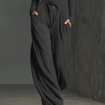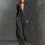 An elegant jumpsuit in dark grey with a touch of shine, featuring a front zip and a relaxed fit with wide legs. Made from stretchy and draped fabric for a chic and comfortable look.