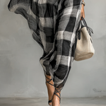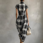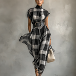 Maxi Check Chiffon Dress with High Neck and Short Sleeves for Women