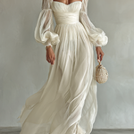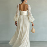 Women's Long Maxi Dress in Chiffon with Square Neckline and Long Sleeves