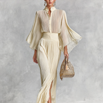 Two Piece Set High Neck Pleated Chiffon Shirt for Women with Bell Sleeves and Long Skirt with Slit