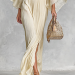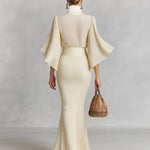 This elegant two-piece set features a pleated chiffon shirt with a refined high collar and dramatic bell sleeves, paired with a flowing floor-length skirt that includes a stylish slit. The combination offers a sophisticated silhouette perfect for formal occasions.