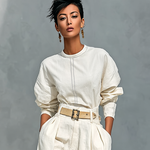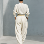 Long Sleeve Round Neck Shirt and Wide Leg Trousers Set in Cotton and Linen for Women (belt not included)