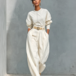 This stylish two-piece set features a breathable cotton and linen shirt with a classic round neck and long sleeves, paired with wide leg trousers for a relaxed and comfortable fit. The set is designed for effortless fashion, perfect for casual or workdays. (Belt not included.)