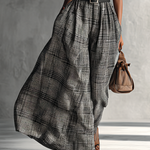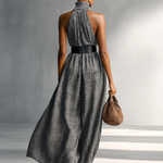 This elegant check maxi dress features a refined high neck and a sleeveless cut, offering a balance of structure and grace. The belted waist defines the figure, while the classic check pattern adds a touch of timeless charm.