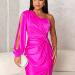 • Timeless Elegance: This one-shoulder dress with a flowing design and side slit embodies modern style and elegance. Ideal for special occasions, it gives you a confident and sophisticated look.