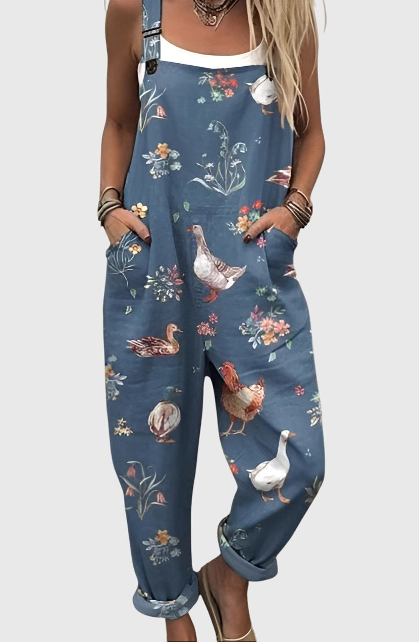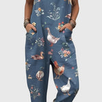Karen | Landhaus Pants bring the landscape to life with every step. Featuring ducks, chickens, and wildflowers illustrated against a soft Slate blue background, this design celebrates the slow lifestyle and simple pleasures – perfect for a morning at the market, casual activities, or weekend getaways.