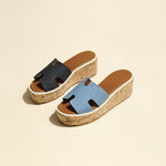 Sandals made from vegan leather effect material, featuring an ultra-light cork platform with an “H” cut for optimal comfort and summer style.