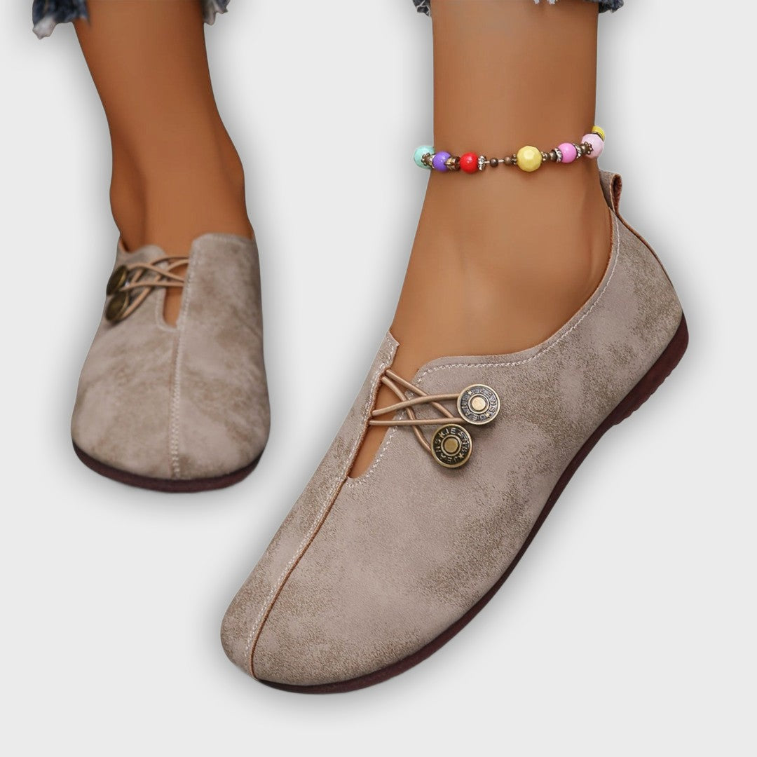 The elastic straps with decorative buttons allow for easy on and off while adding a touch of style.