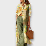 Amaril is like a journey through distant landscapes – light, free, and full of expression. The flowing long shirt with a botanical print plays with shape and color, while the wide pants elegantly shape your silhouette. Whether worn open or loosely tied – Amaril adapts to you and makes every look special.