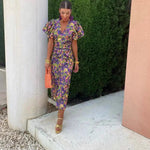 This evening dress turns heads: featuring structured puff sleeves, a deep V-neckline, and a ruched waist. The tailored silhouette and vibrant pattern make it the perfect choice for anyone looking to stand out in style.