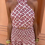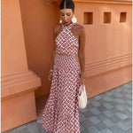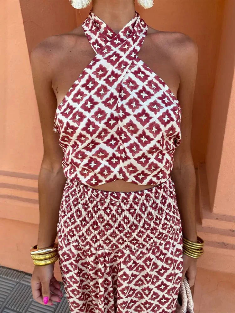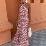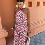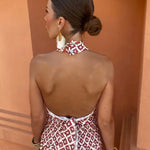 • Features: Halter neckline, open back, geometric pattern, sleeveless