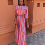 This elegant dress features three-quarter length sleeves, a long flowing skirt, and refined cutouts at the waist. The vertical pattern elongates the silhouette, while the fitted top and wide collar combine structure and ease.
