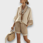 Verina combines playful lightness with a Mediterranean vibe. The loose cut, delicate checkered pattern, and unique collar with a tie make this suit a stylish companion for sunny days at the beach or relaxed strolls in the city.